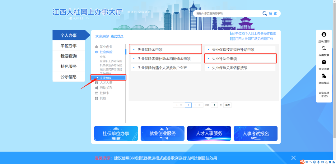 (1)國家社會保險公共服務(wù)平臺:本人注冊并登錄國家社會保險公共服務(wù)平臺(網(wǎng)址:http://si.12333.gov.cn),選擇失業(yè)保險或主題服務(wù)中的待遇申請,找到失業(yè)保險待遇申領(lǐng),選擇失業(yè)保險金網(wǎng)上申領(lǐng)或失業(yè)補(bǔ)助金網(wǎng)上申領(lǐng),閱讀并填寫相應(yīng)信息進(jìn)行申領(lǐng)。